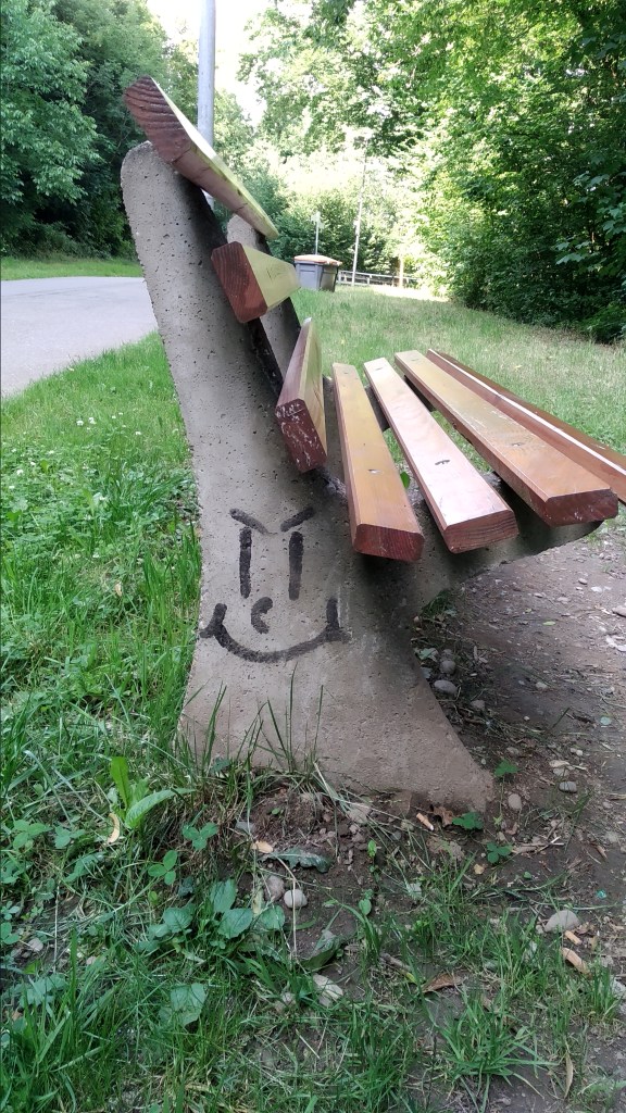 Neulich hat mich eine Parkbank angeschaut. Stand am Wegrand und lachte mir einfach – eher frech – entgegen. Der Blick wirkt ein bisschen herausfordernd, aber trotzdem ist es ein Grinsen. Und bevor ihr glaubt, dass mir die Sommerwärme zu Kopf gestiegen ist: